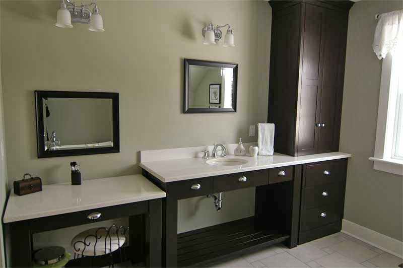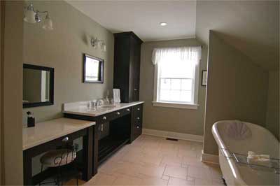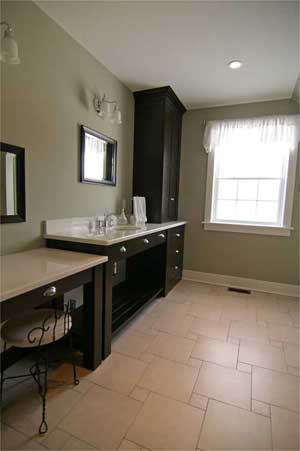 Lisa and Donald Veinotte chose darker cabinetry for a relaxing atmosphere in the upstairs bathroom.(Click photos for larger versions) |